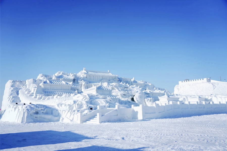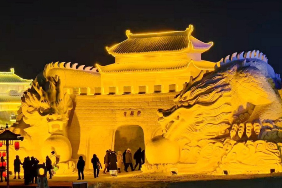第三届太平池冰雪美食禧乐汇依托太平池30万平方米广阔场地与天然冰湖资源,以7.5万立方米冰雪打造集“游、乐、玩、食、学”于一体的冰雪乐园,让千年黄龙府的历史文脉在寒冬中焕发新生机。本届太平池冰雪美食禧乐汇雪雕以爱国情怀和保护文化传承为主要元素,雪雕根植黄龙府属地,让历史符号与地域记忆绑定,成为 “以雪载史、以字传情” 的文化互动空间。景区以厚重的“辽金文化”为魂,用冰雪为材,复刻打造的冰雪黄龙府雪雕群,巍然矗立于太平池畔。