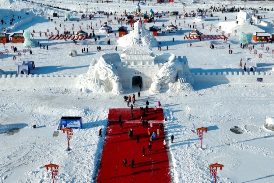 冰雪游乐区内,首先映入眼帘的是一座高达15米的“黄龙府”主题雪雕,双龙盘绕的主城门气势恢宏,300米炫彩冰滑梯与200米雪滑梯成为人气焦点,游客飞驰而下,体验速度激情;雪地摩托、冰上卡丁车、拖拉机拉雪圈、“套大鹅”等二十余项游乐项目,吸引众多家庭参与。